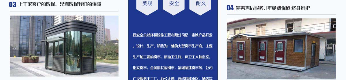西安金永鴻環(huán)保設(shè)施工程有限公司是專業(yè)的崗?fù)どa(chǎn)廠家!公司產(chǎn)品主要有:不銹鋼崗?fù)?、收費(fèi)崗?fù)ぁ⒈0矋復(fù)ぁ⒄九_(tái)及鋼結(jié)構(gòu)崗?fù)ぁ⒆o(hù)欄等。我們將以質(zhì)量?jī)?yōu)先、價(jià)格優(yōu)先、服務(wù)優(yōu)先的理念回饋廣大新老客戶對(duì)金永鴻長(zhǎng)期以來(lái)的支持和關(guān)懷。我們將不斷創(chuàng)新,追求卓越,為您打造最完美的品質(zhì)、最優(yōu)質(zhì)的服務(wù),讓您買得放心、用得舒心。金永鴻與您共創(chuàng)輝煌!